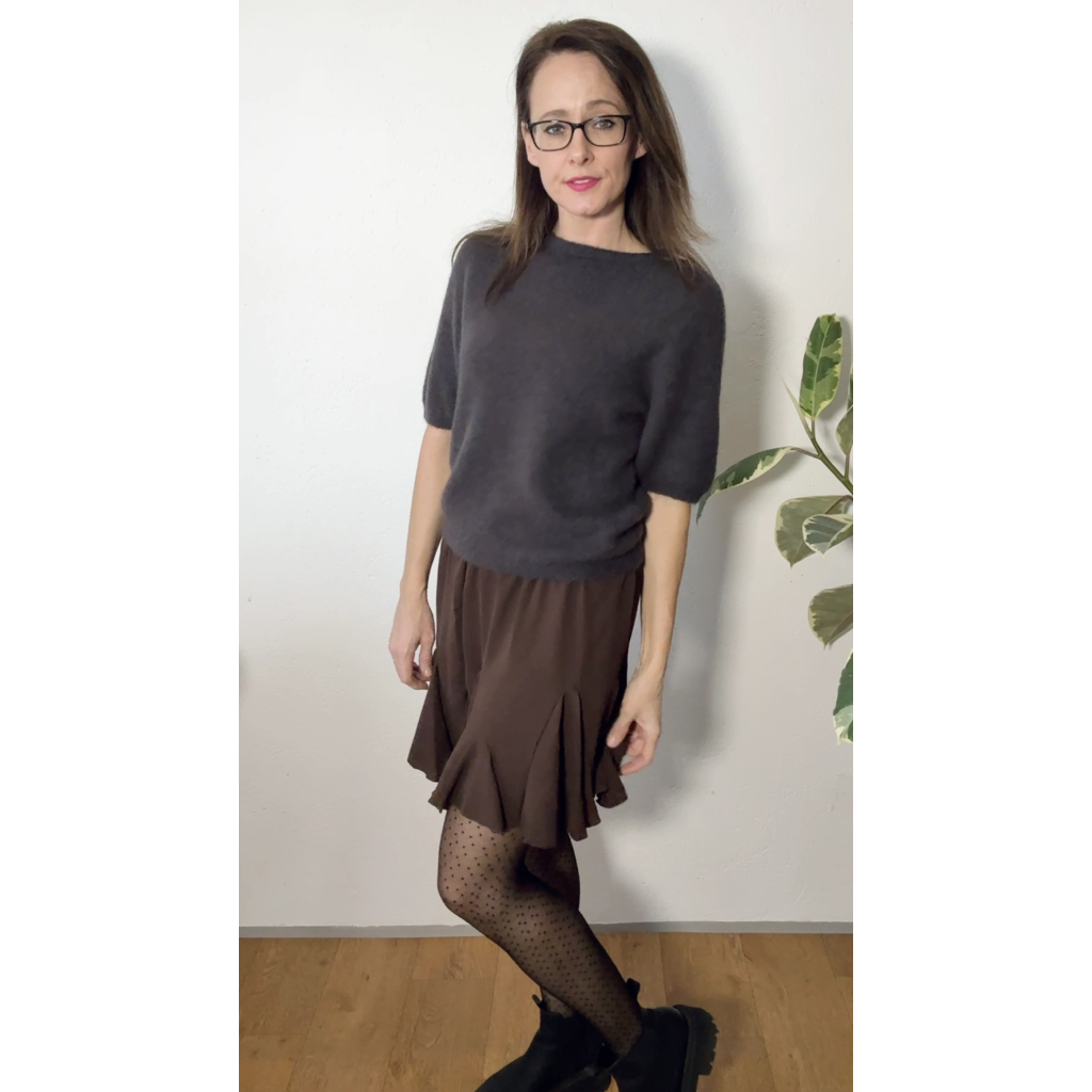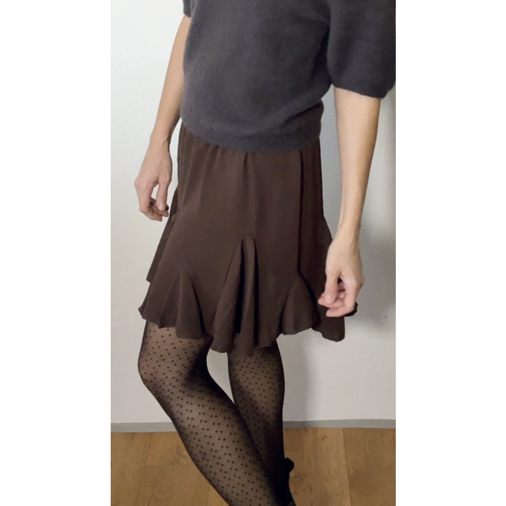 Čokoládová kolová sukně je ideální volbou pro ty, které milují zemitý minimalismus a nadčasovou eleganci. Jemný hnědý tón působí teple a žensky, snadno se kombinuje a hodí se pro každou příležitost – do práce, na kávu s přáteli i na rodinnou oslavu.
