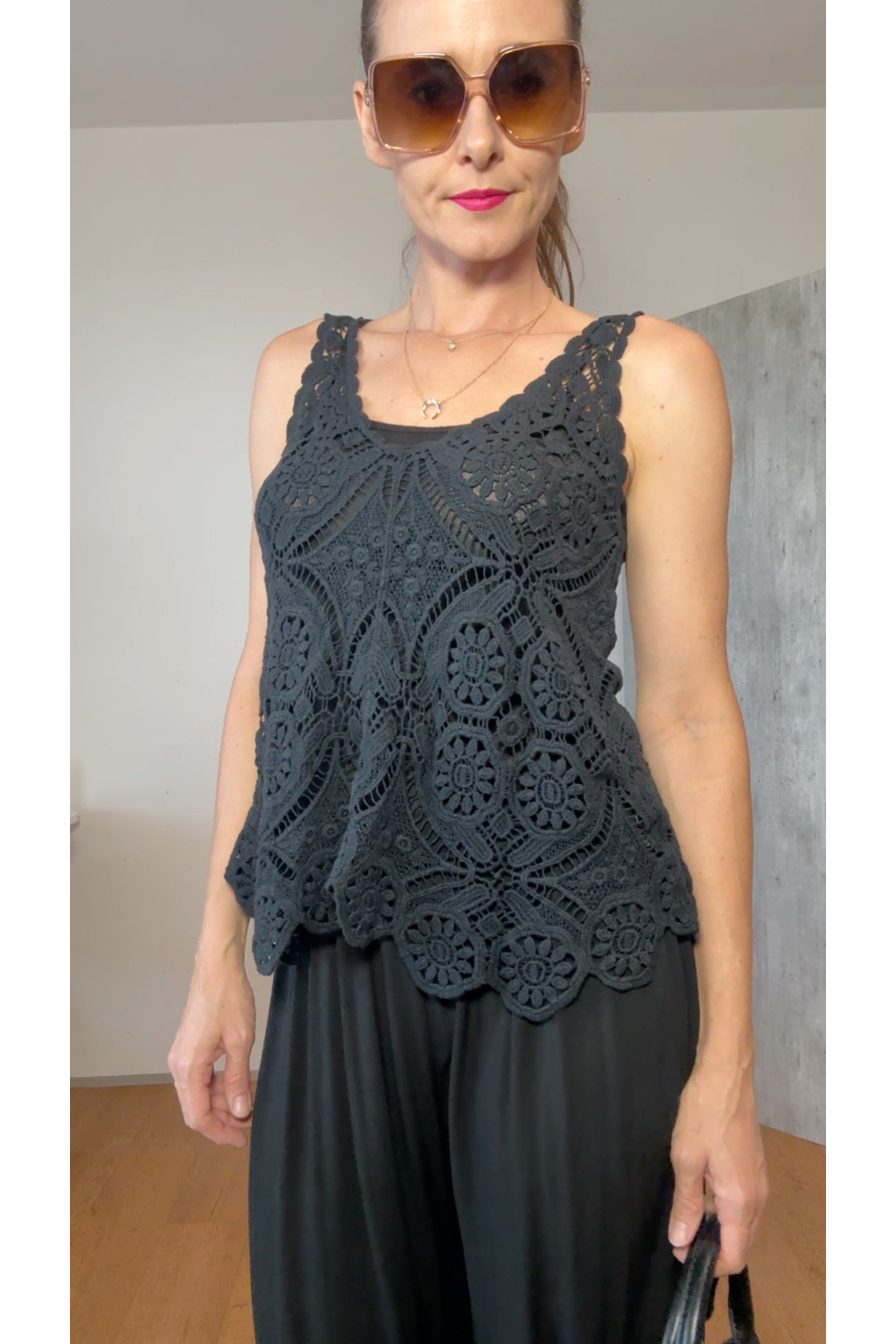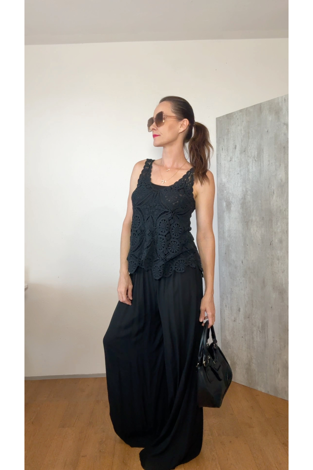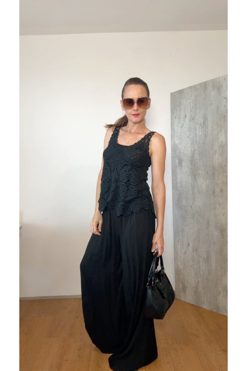 Objevte kouzlo letní elegance s naší černou ažurovou blůzkou 2v1, která je ideální pro horké letní dny.
