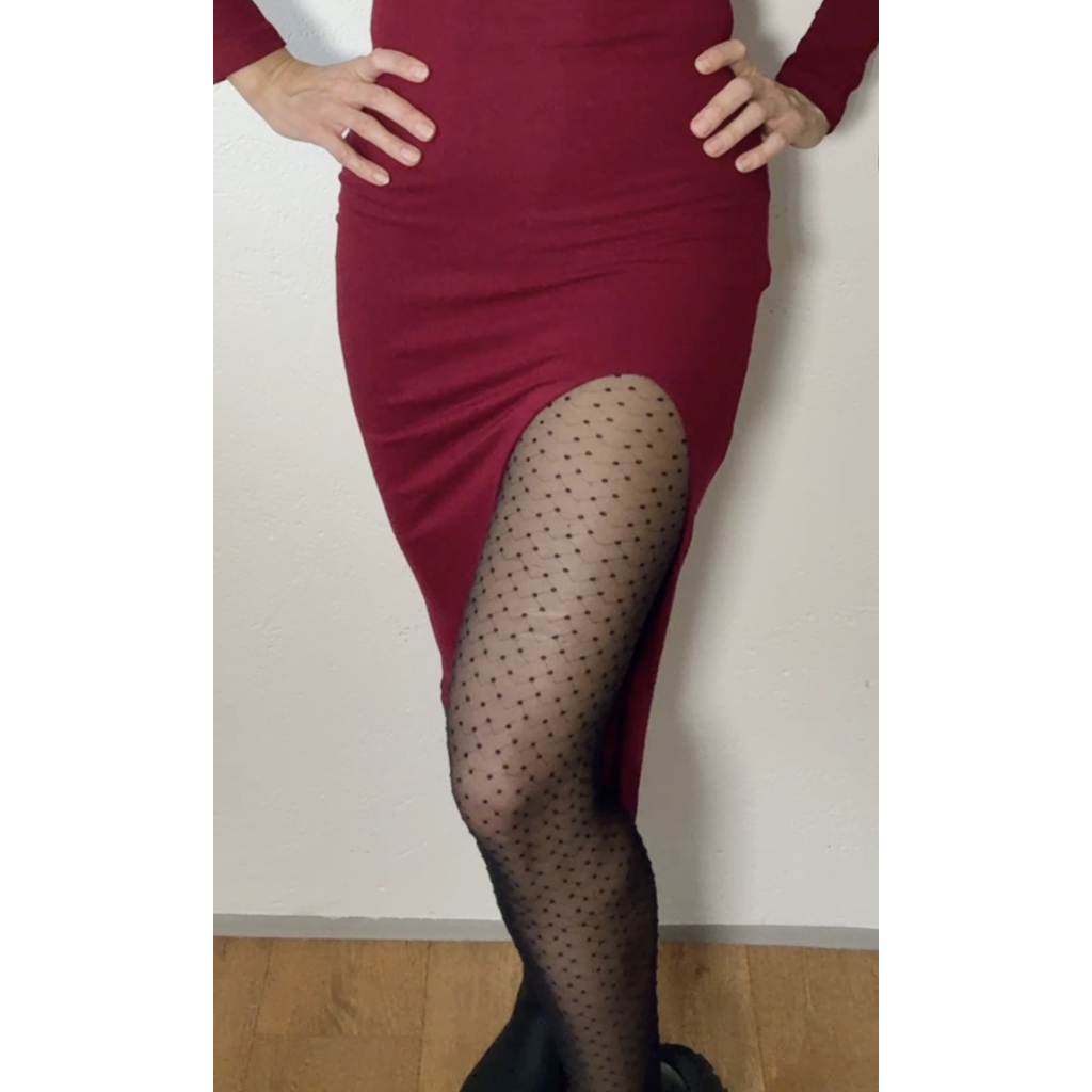 Midi přiléhavé vínové šaty s rozparkem